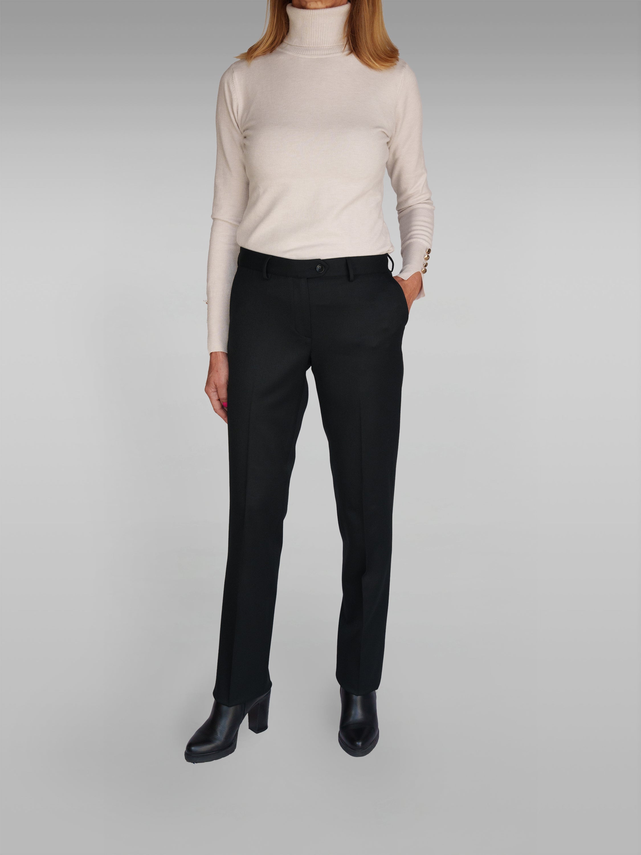 These medium-rise women's flat-front trousers are available in classic grey and black, combining timeless style with modern tailoring. They offer two functional open front pockets for practicality, complemented by two closed back pockets that add subtle sophistication without bulk. Featuring six belt loops, these trousers provide flexibility to accessorize with belts for a personalized look. The zip front closure with a button secures the fit while maintaining a sleek silhouette, making these trousers suitable for both professional settings and elegant casual wear. Crafted to enhance comfort and style, they deliver a polished, versatile wardrobe essential.