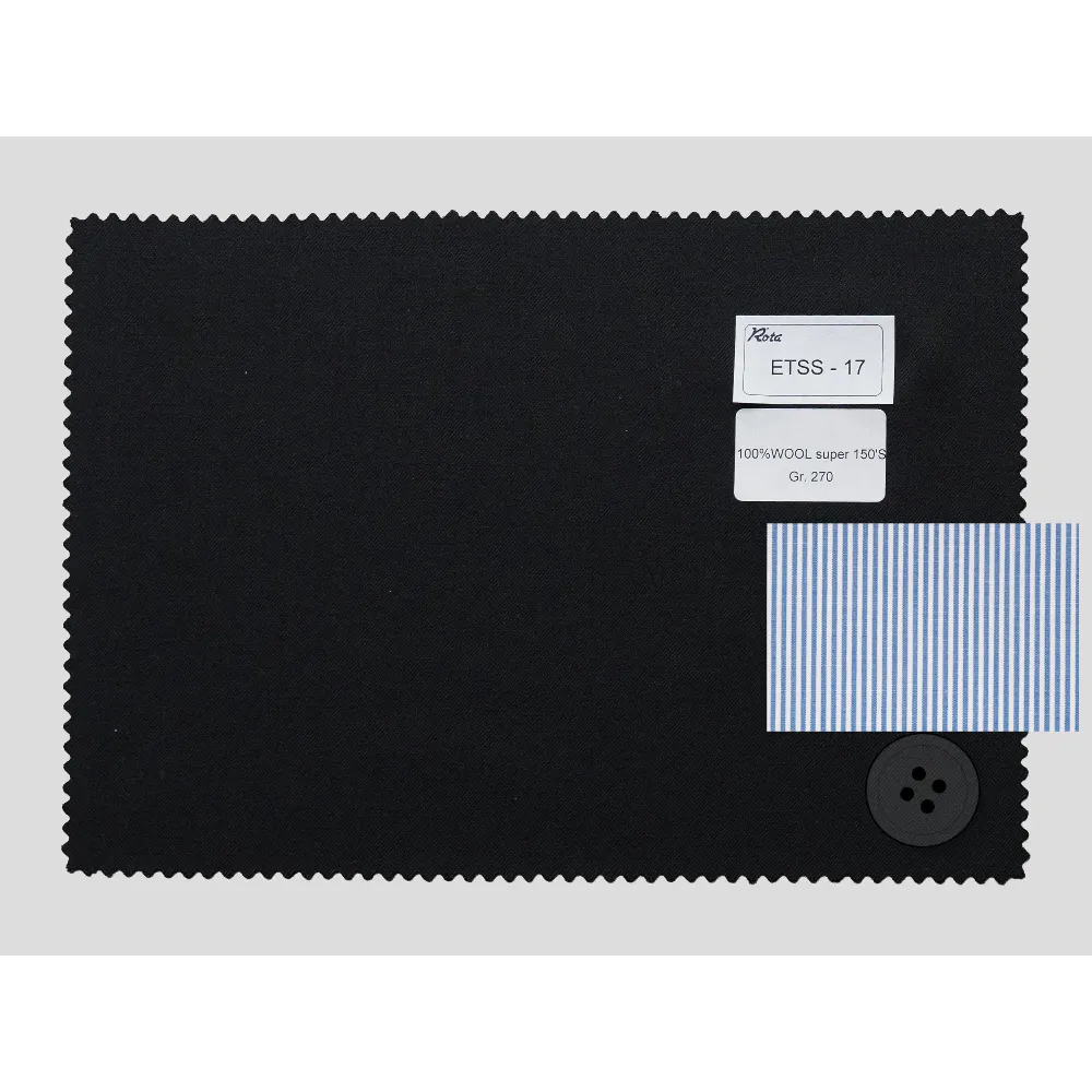 Wool Fabrics {"Fabric": "100% Wool Super 150'S", "Season": "Summer", "Weight": "270gr/m2", "Code": "ETSS-17", "Label": "NEW Black Worsted Wool 150'S", "Price": "€599.00"} [ETSS-17] x1 (599)