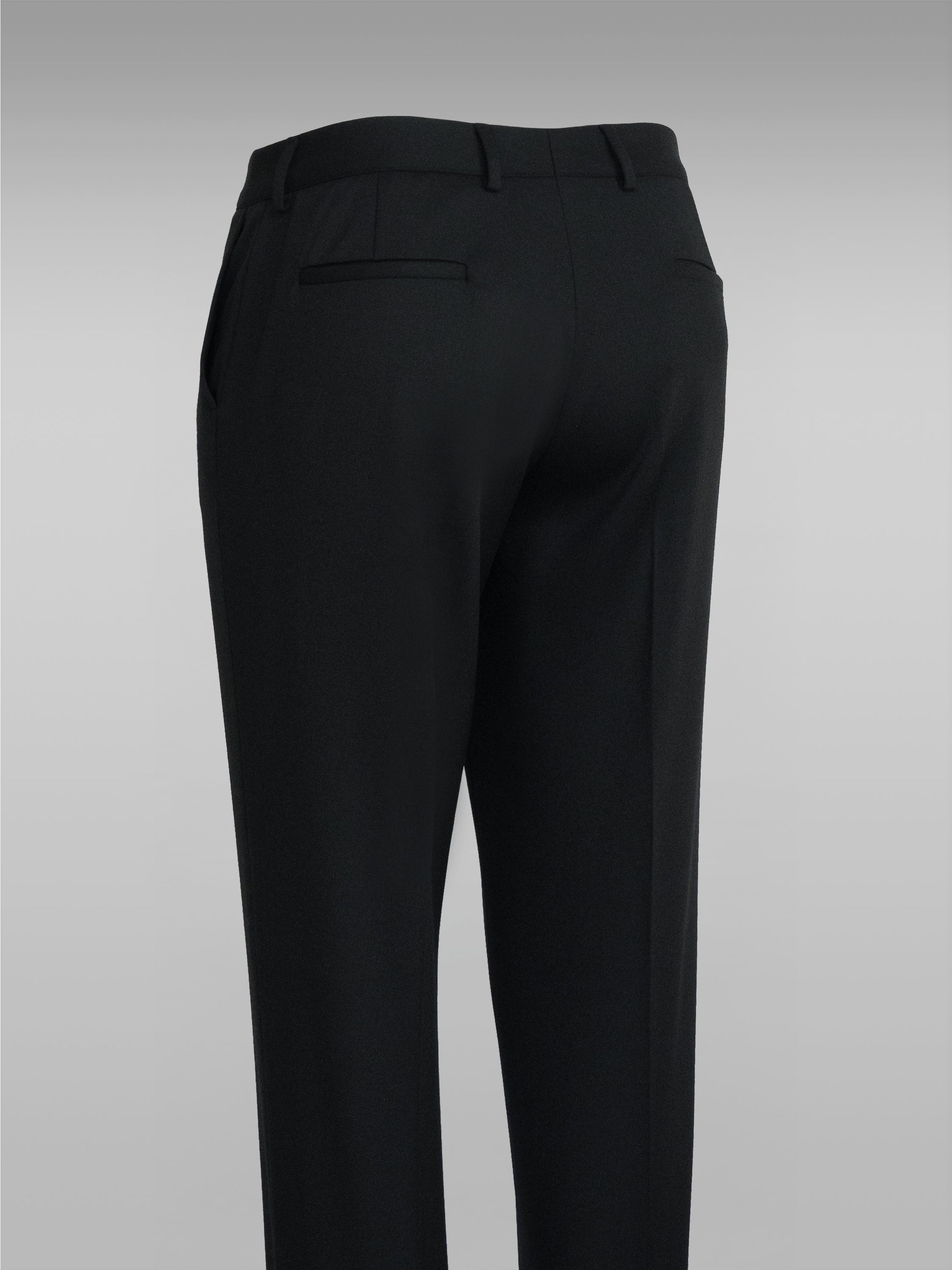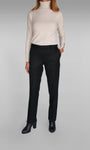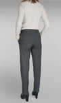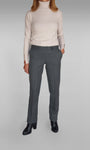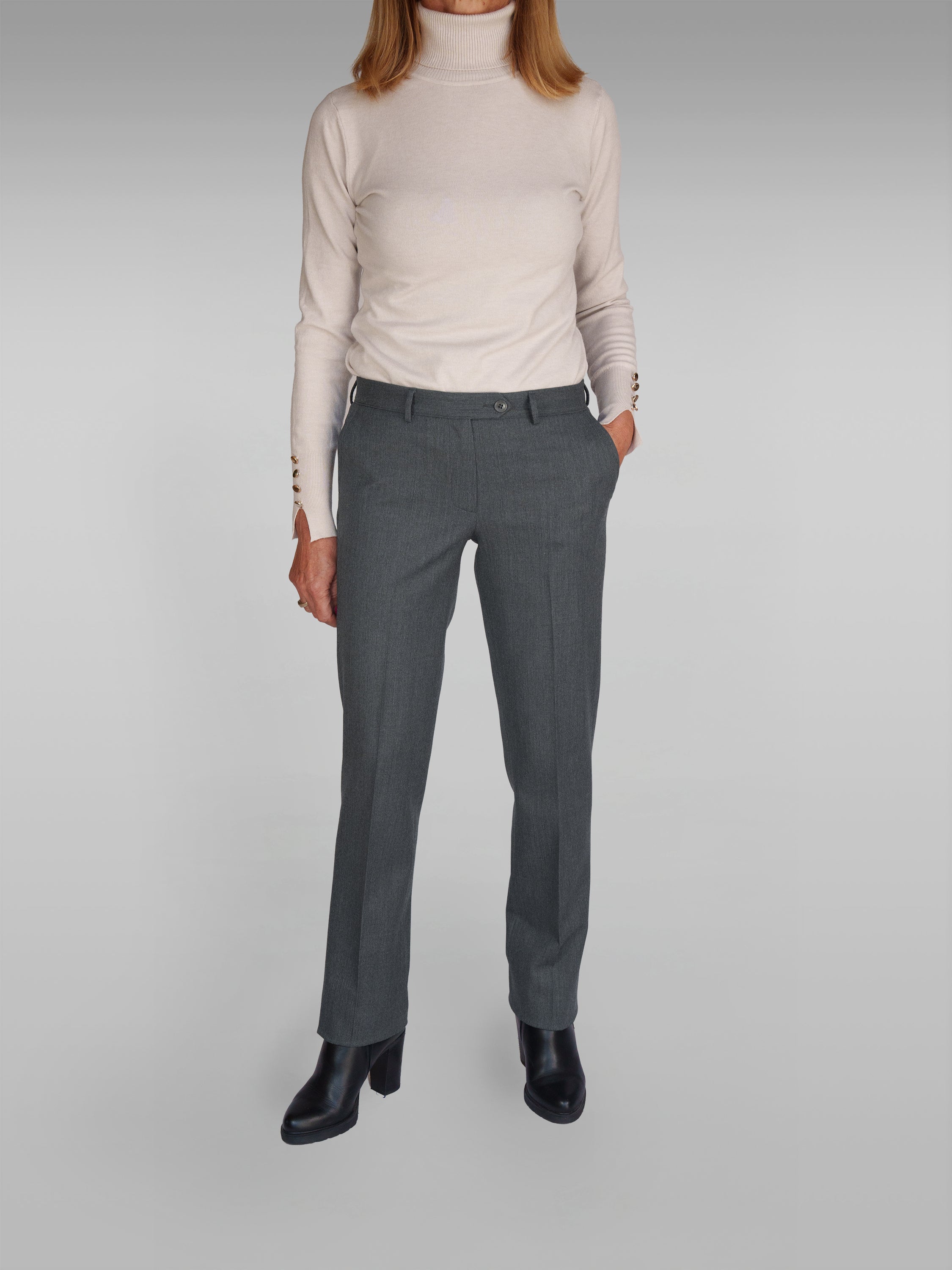 These medium-rise women's flat-front trousers are available in classic grey and black, combining timeless style with modern tailoring. They offer two functional open front pockets for practicality, complemented by two closed back pockets that add subtle sophistication without bulk. Featuring six belt loops, these trousers provide flexibility to accessorize with belts for a personalized look. The zip front closure with a button secures the fit while maintaining a sleek silhouette, making these trousers suitable for both professional settings and elegant casual wear. Crafted to enhance comfort and style, they deliver a polished, versatile wardrobe essential.