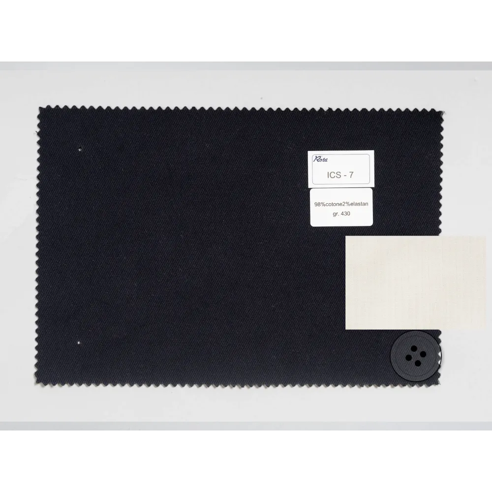 Cotoni {"Tessuto": "98% Cotone 2% Elastan", "Stagione": "Inverno", "Peso": "430gr/m2", "Codice": "00149", "Etichetta": "Cotone Stretch Blu Scuro", "Prezzo": "€409,00"} (409)