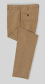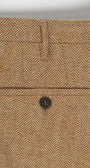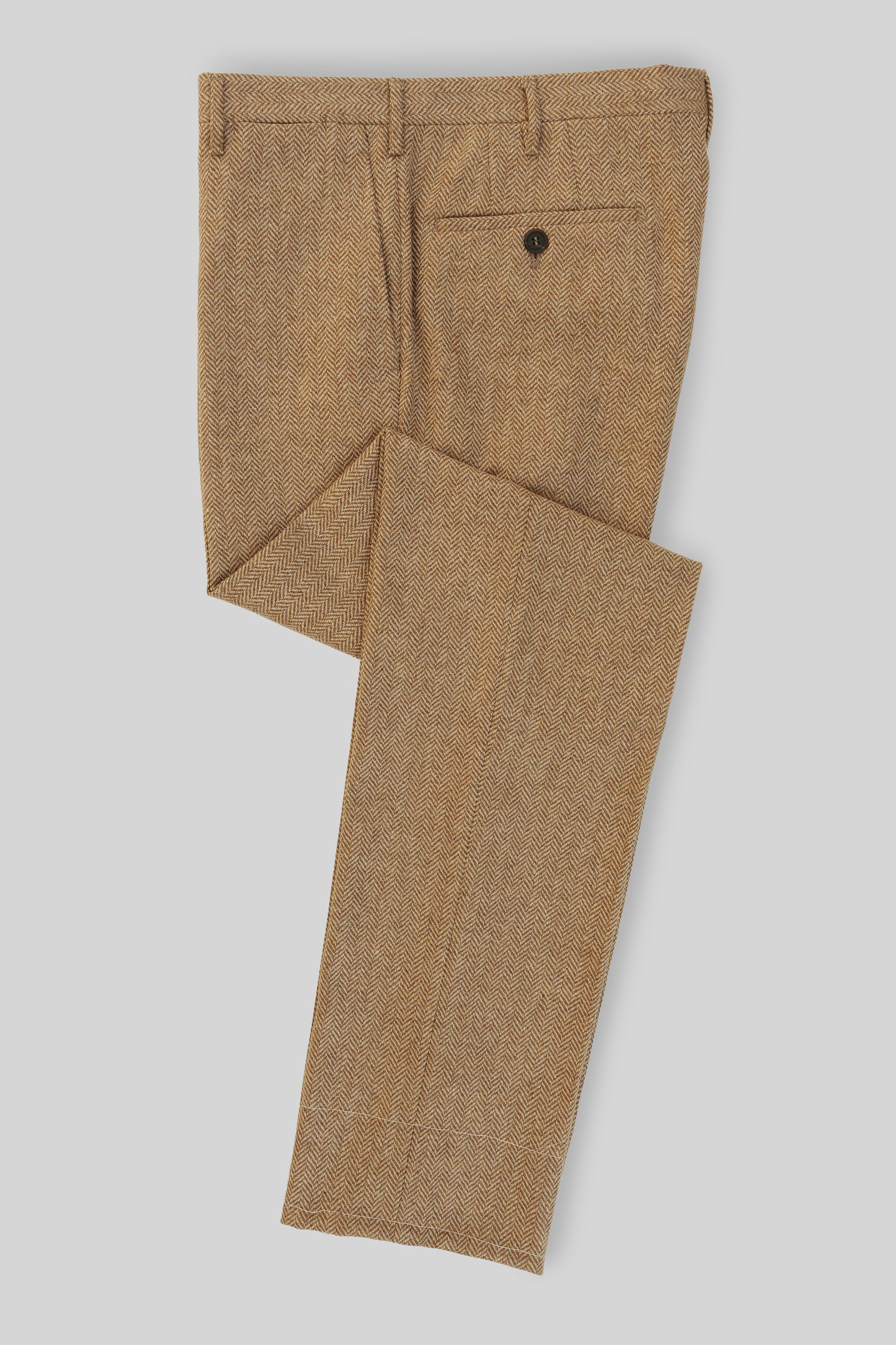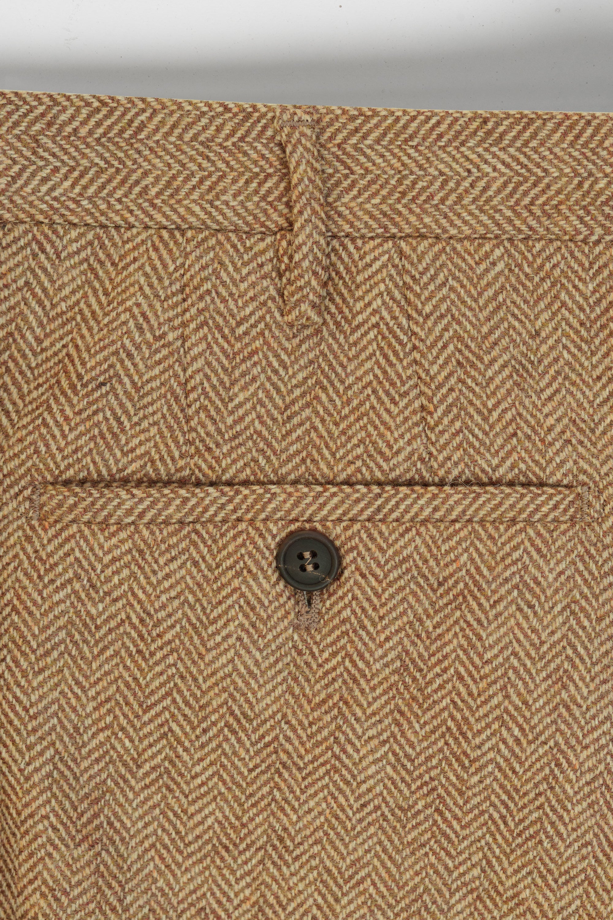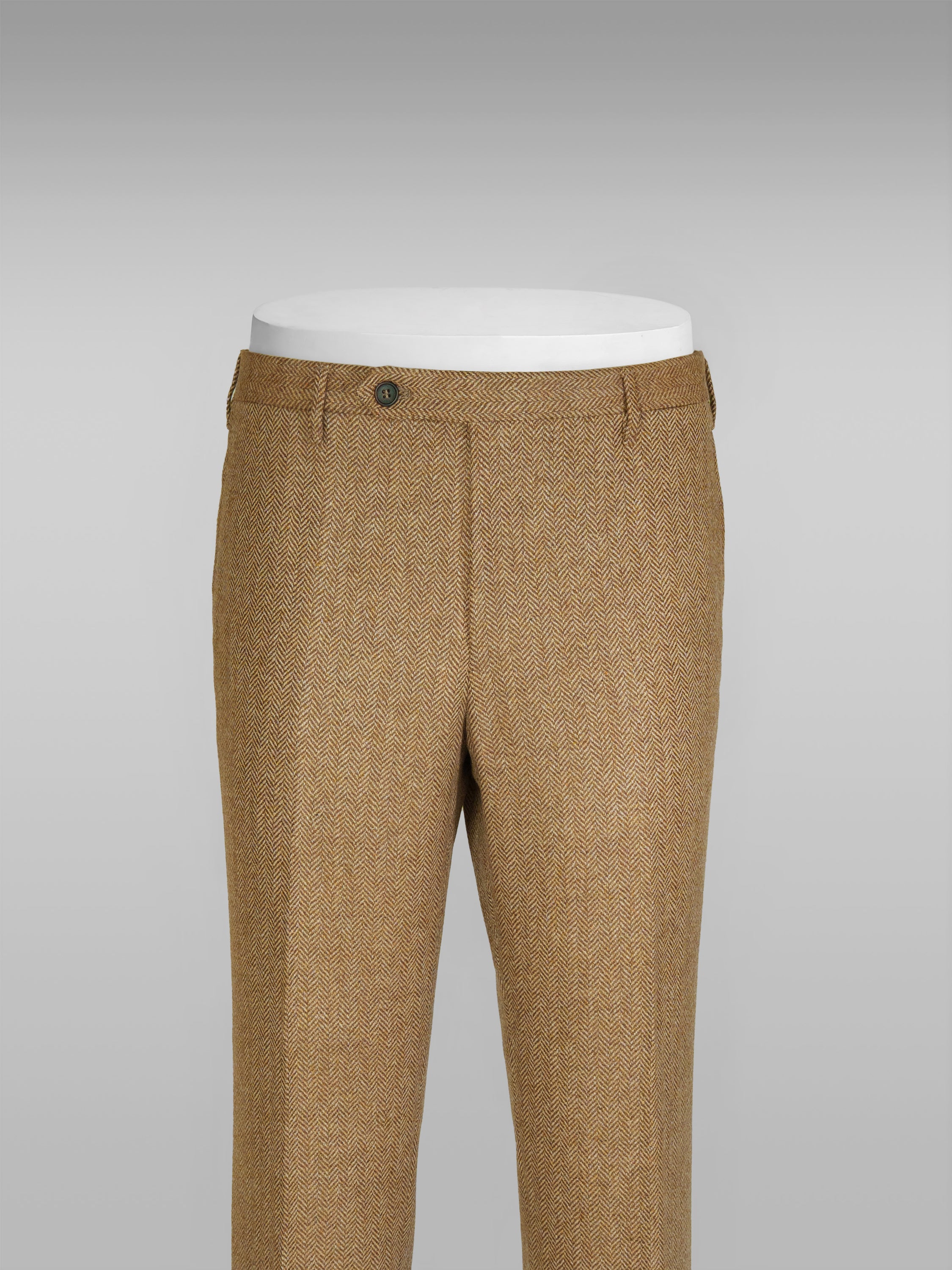 Questi pantaloni con motivo a spina di pesce color miele diventeranno presto un capo fondamentale del tuo guardaroba. Questo modello a vita media e vestibilità regolare con davanti piatto è stato realizzato in Italia in flanella di lana e cashmere pesante di alta qualità. L'aspetto tweed di questo tessuto non deve trarti in inganno, perché l'alta qualità della lana e del cashmere che lo compongono lo rendono molto morbido e piacevole al tatto.