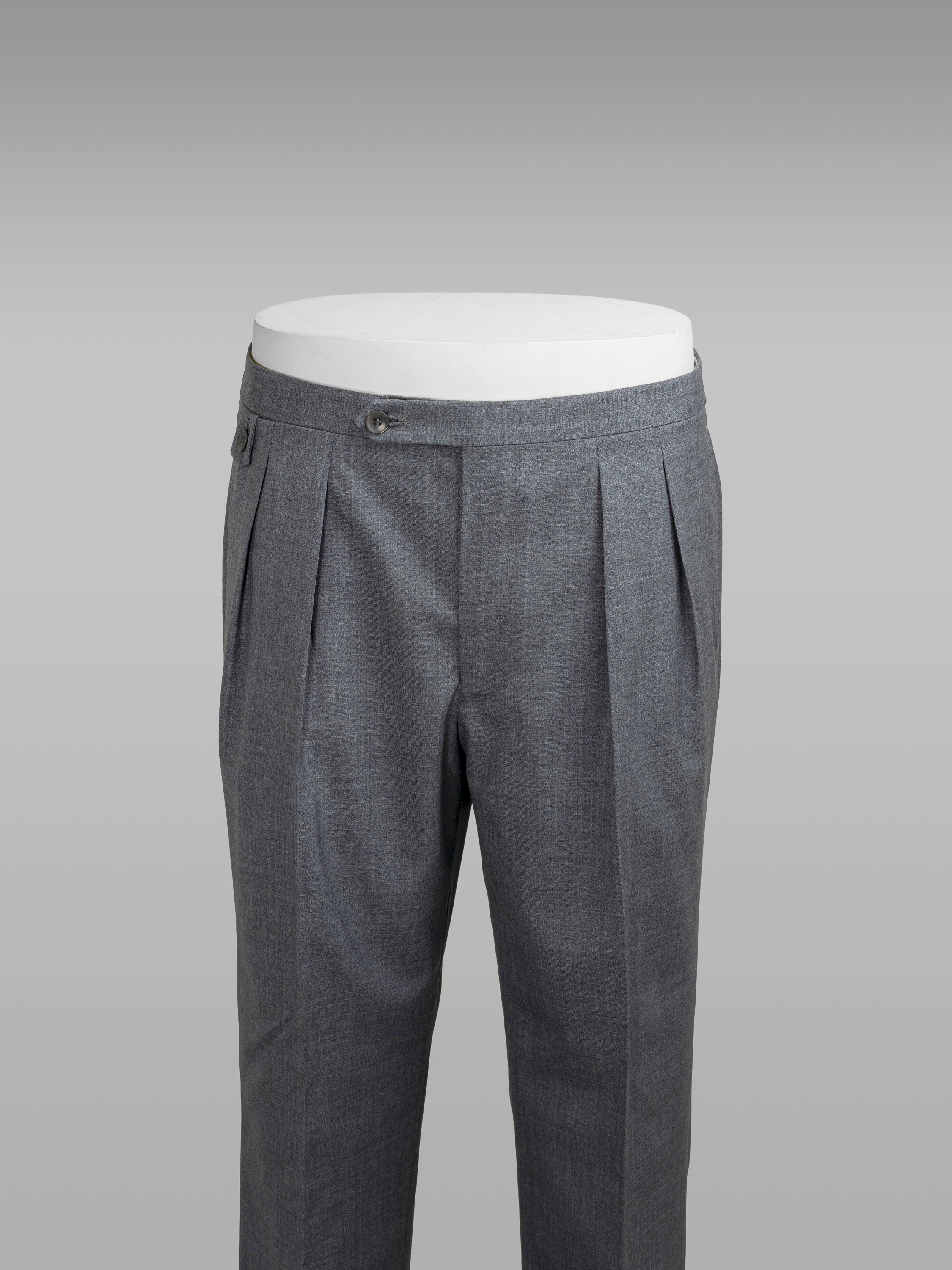- Cerniera, pieghe anteriori, quattro tasche, regolatore laterale New York, passante sulla tasca portamonete