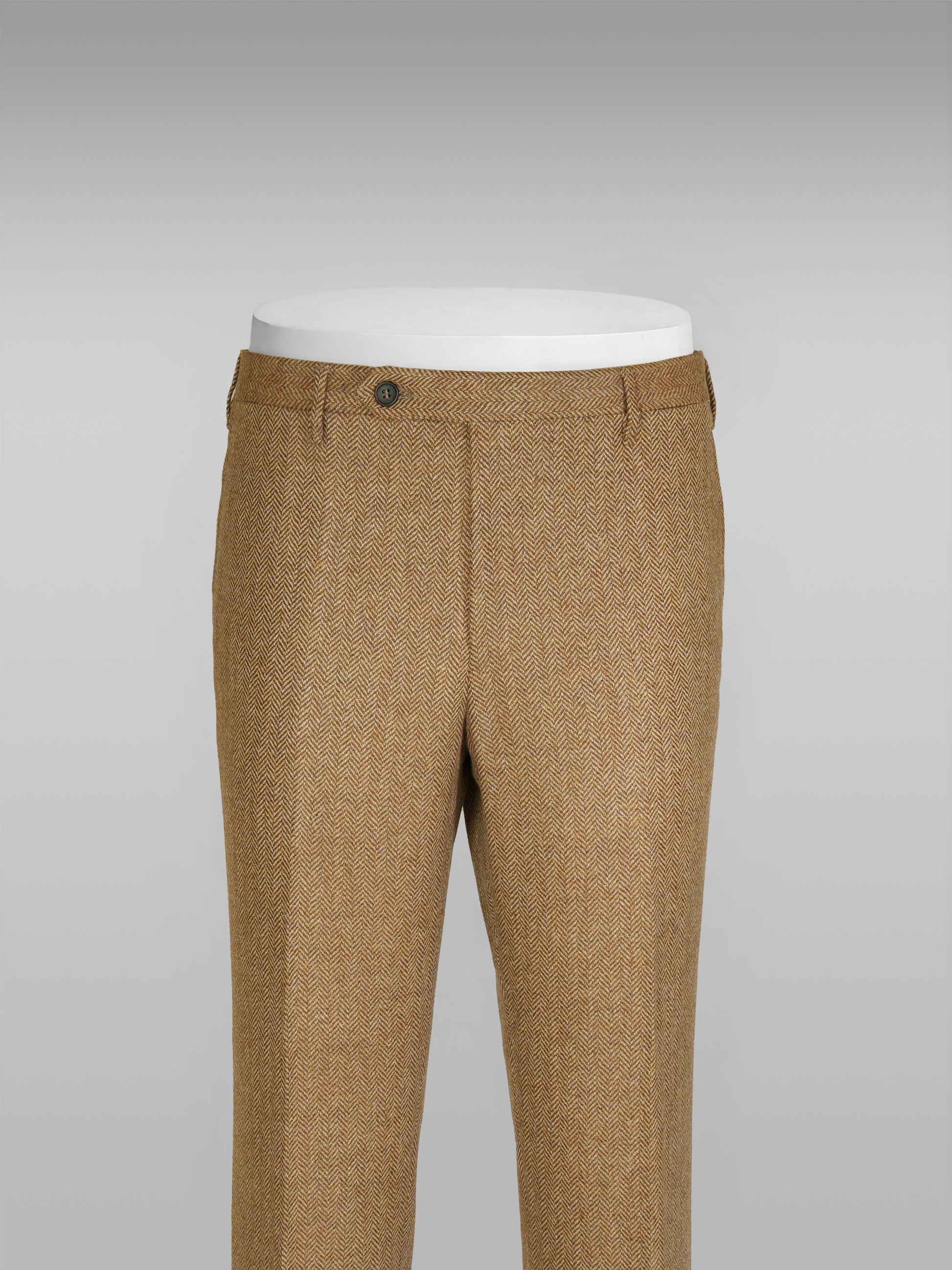 This honey herringbone pattern trousers will fast become a key part of your core collection. This medium-rise regular-fitting flat front pair has been made in Italy from a heavyweight high quality wool flannel and cashmere. The tweed aspect of this fabric should not mislead you because the high quality of the wool and cashmere that make up this fabric make it very soft and pleasant to the touch..