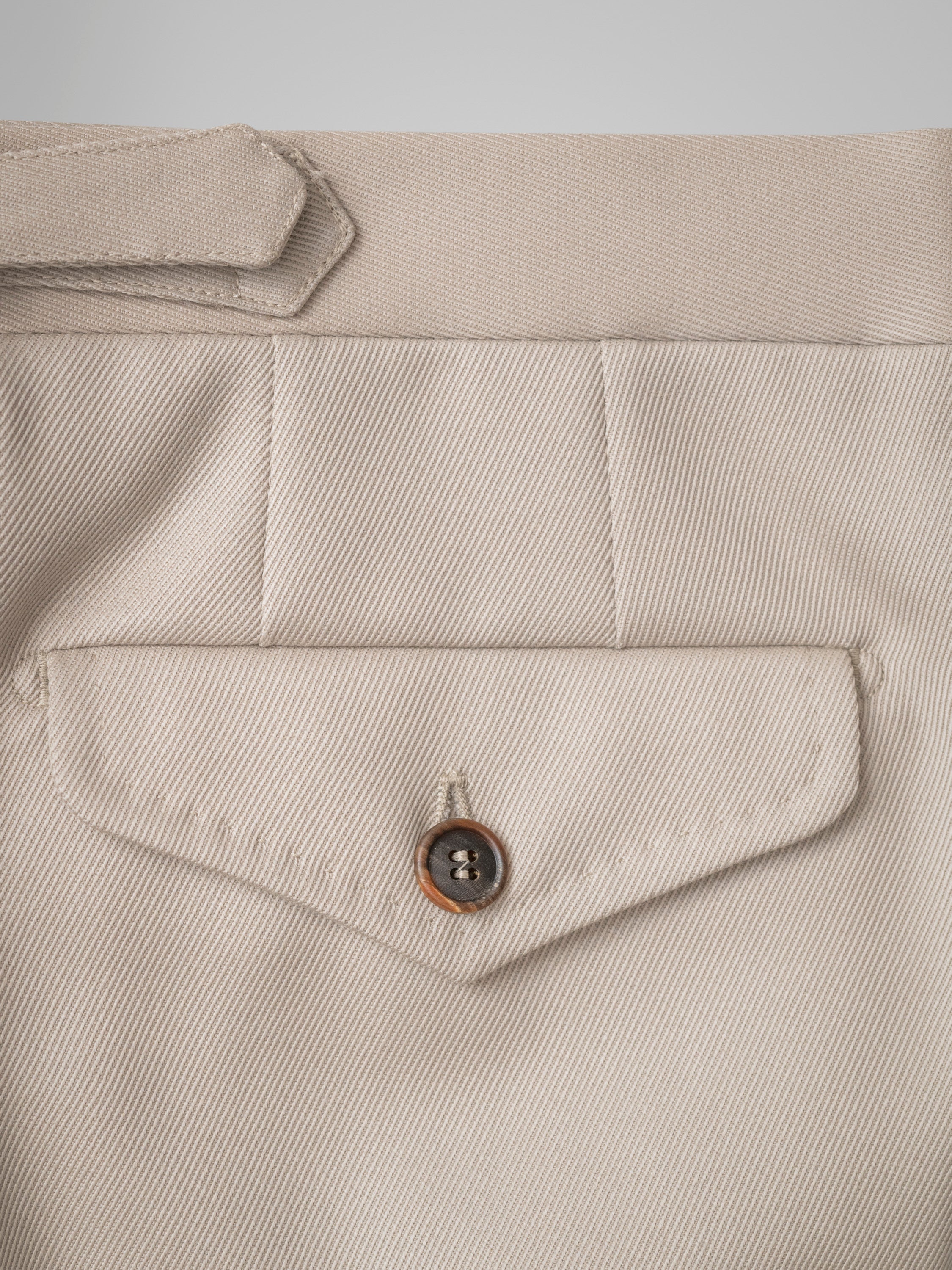An exclusive fabric for an exclusive trousers. This light beige trousers will fast become a special part of your core collection. This high-rise regular-fitting pair has been made in Italy from a mediumweight high quality wool cavalry twill made especially for us. You can’t find this fabric anywhere else. The buttonfly, the flap pockets, the legs stitchings and the buckle side adjusters represents a part of the traditional tailoring knowledge our company bring to the present time. You can wear it without the belt or using suspenders for a more classic look.