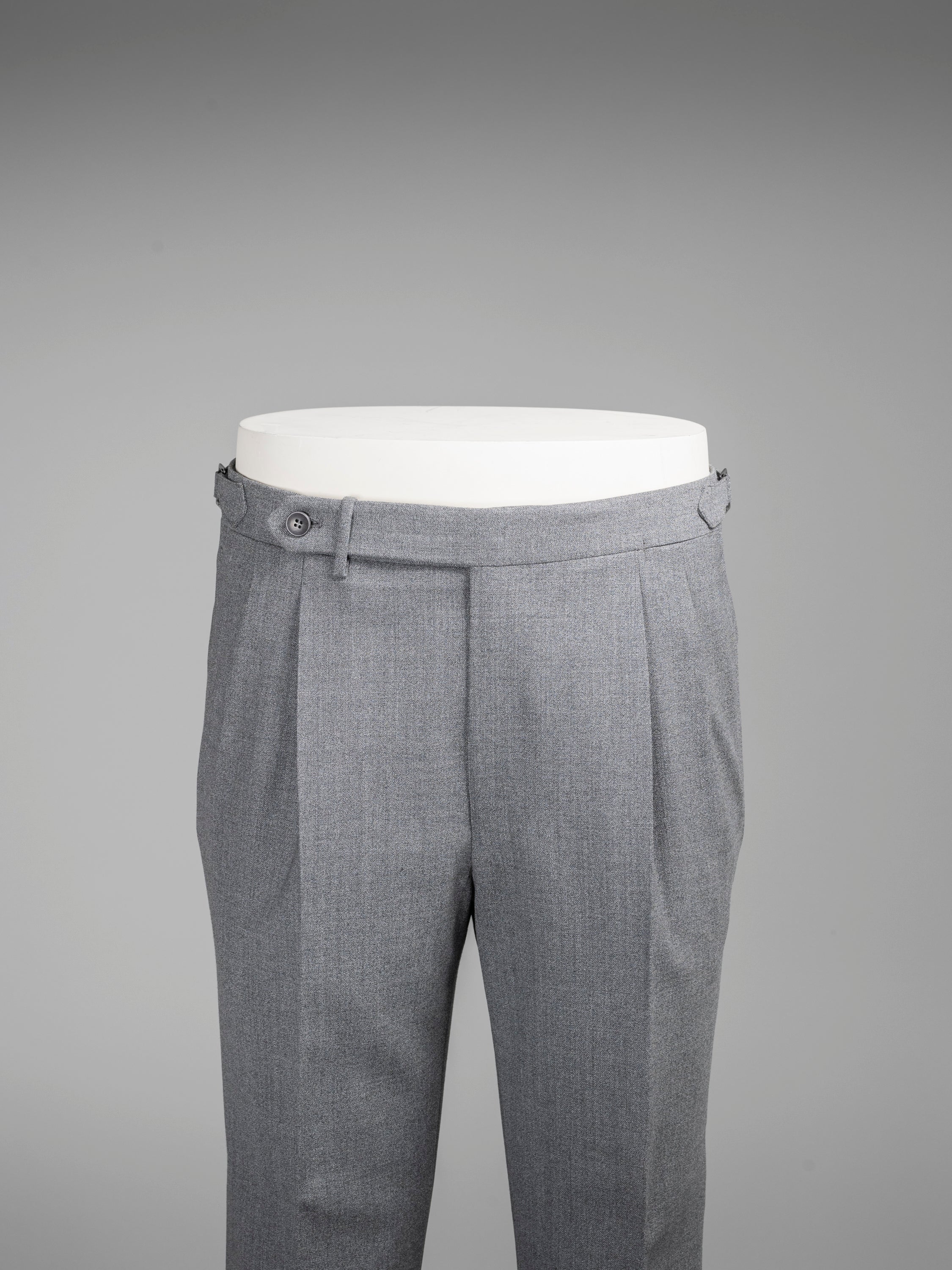 These light grey trousers are the ideal trousers to have with you in your suitcase for a business trip or for those who don't want to worry about folds and need a trousers that look perfect for a long time. This high-rise regular-fitting double pleats pair has been made in Italy from a four ply heavyweight high quality wool. The long belt and the buckle side adjusters give to this trousers a very detailed gentleman look. You can wear it withouth the belt or using suspenders for a more classic look.Thanks to its special construction this high twist fabric will make you look always perfect.
